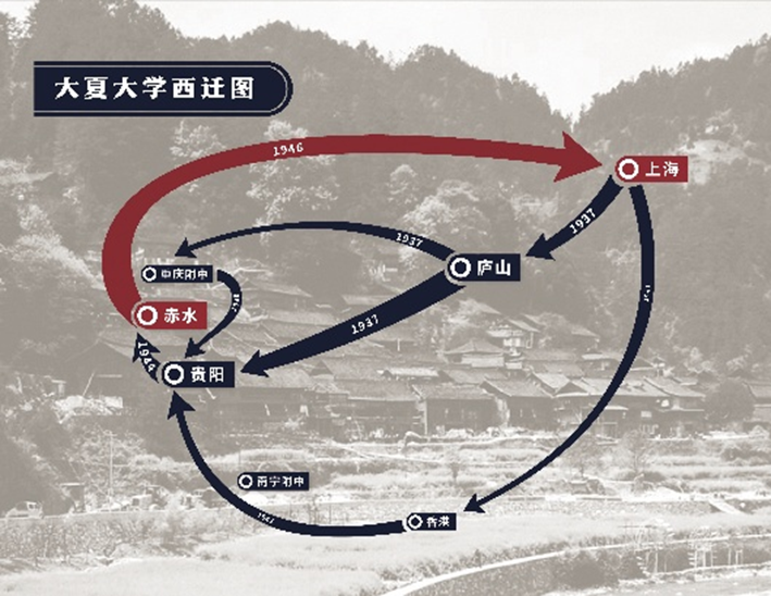 大夏大学自1937年12月迁至贵阳,度过了相对安宁、清贫却丰富的七年。1944年豫湘桂会战失败,日寇兵犯黔南,贵阳奉令疏散。时任大夏大学校长王伯群果敢下令大夏第三次迁校,转移至黔北赤水县。为何迁至赤水,盖出两大考量:一是赤水地处川黔边境,易避战祸;二是预判中国抗战在两年内结束,为大夏沿长江复员上海做战略准备。